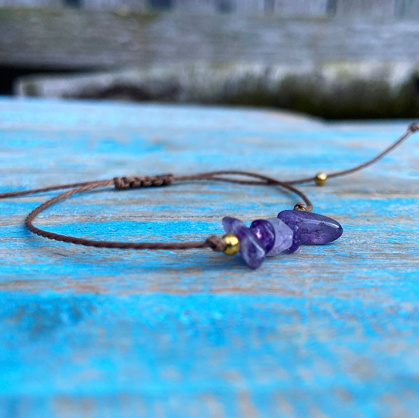 Dit verstelbare armbandje bevat mooie ruwe amethistjes, geregen aan stevig bruin koord met leuke goudkleurige sierkraaltjes. Hieronder lees je meer over de werking en betekenis van amethist.