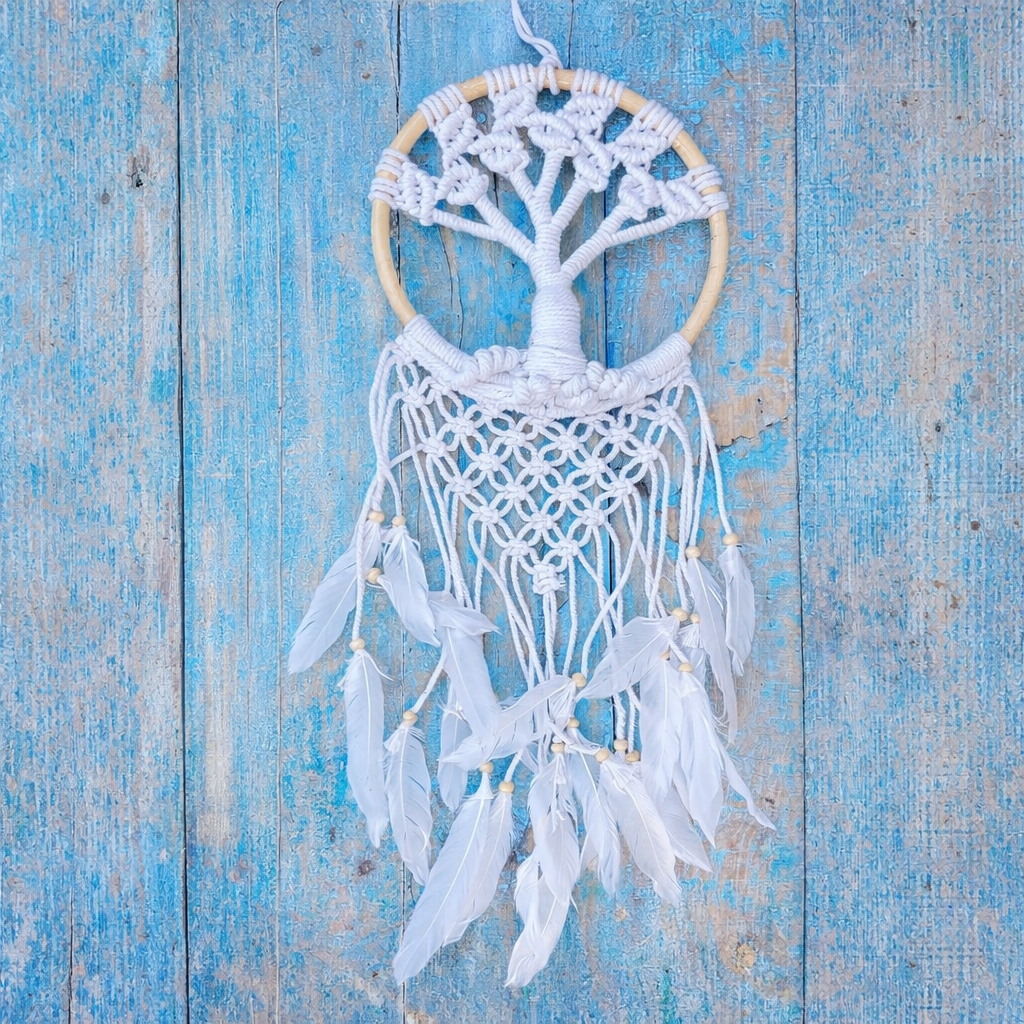De traditionele dromenvanger (web met veren) krijgt een decoratieve en betekenisvolle twist met deze macramé levensboom. Gemaakt op Bali, en hij doet het goed in ieder interieur.