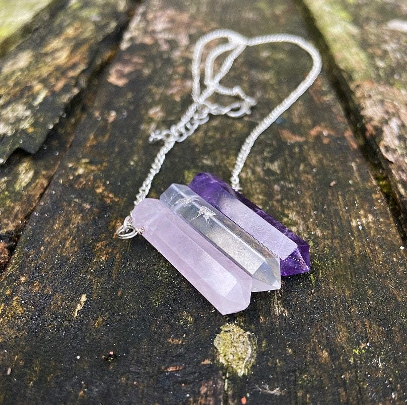 Amethist, berkristal en rozenkwarts aan een in lengte verstelbare ketting van 45-50 cm. De hanger, de drie kristallen samen meten gemiddeld 3-4 bij 4-5 cm.