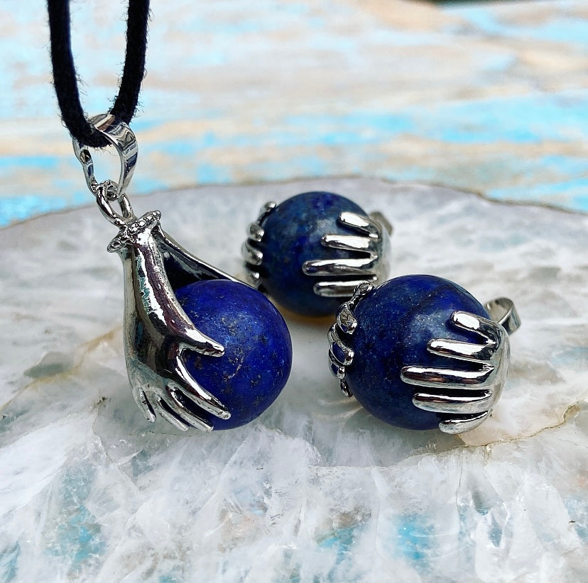 Versilberter Anhänger mit einer Lapislazuli-Kugel, die zwischen zwei heilenden Händen eingeklemmt ist. Ein wunderschönes Symbol der Heilung und Spiritualität.