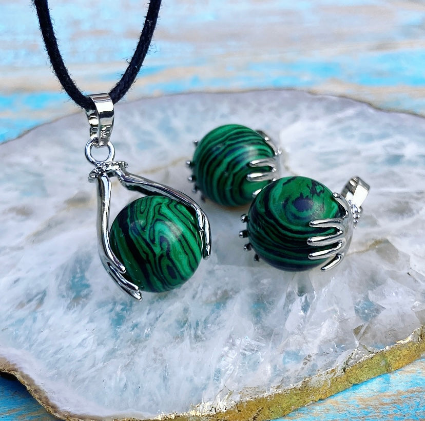 Anhänger mit einer Malachitkugel, eingeklemmt zwischen zwei heilenden Händen. Ein wunderschönes Symbol der Heilung und Spiritualität.