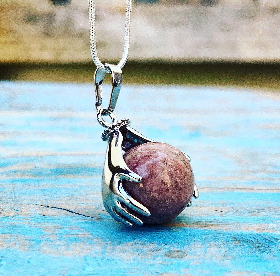 Anhänger mit einer Rhodonitkugel, eingeklemmt zwischen zwei heilenden Händen. Rhodonit beruhigt Stress, Überreizung und unerwartete Rückschläge.