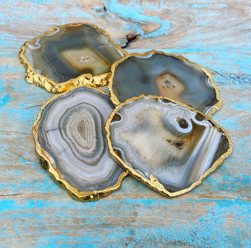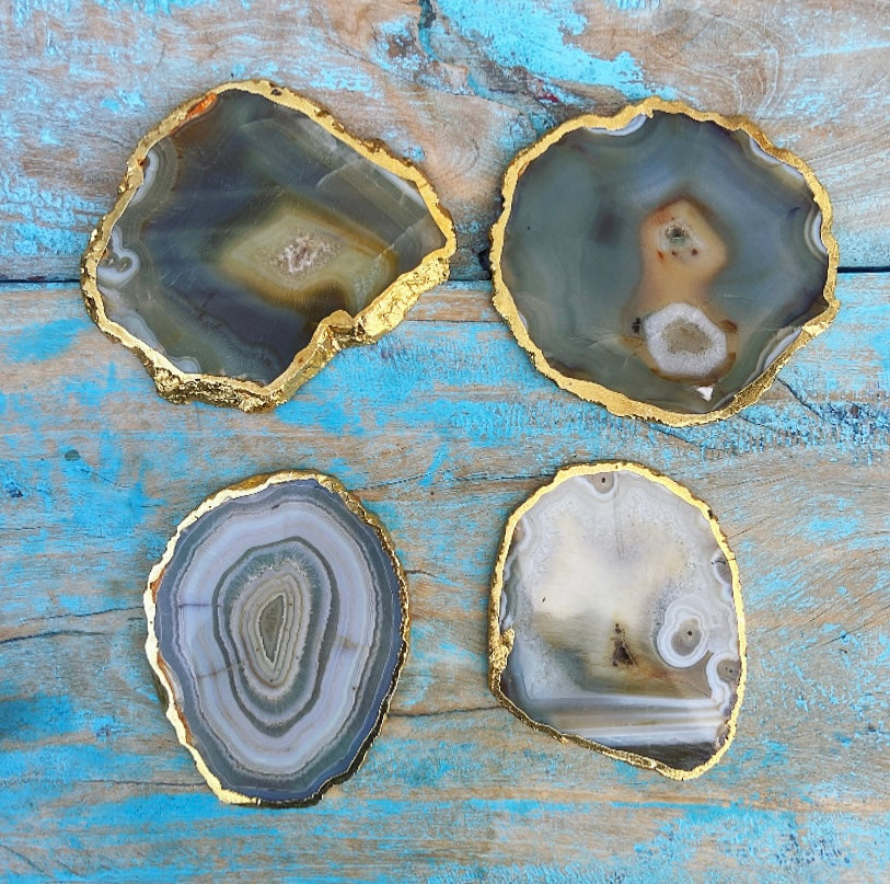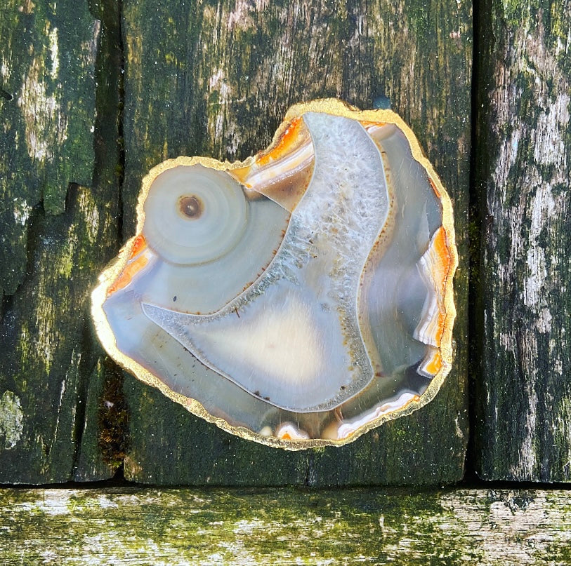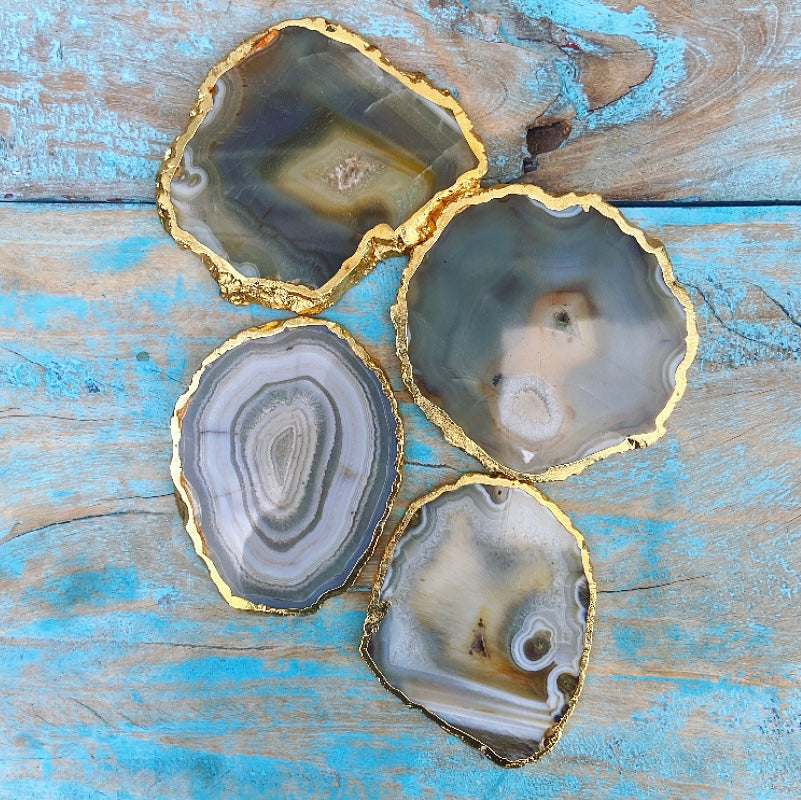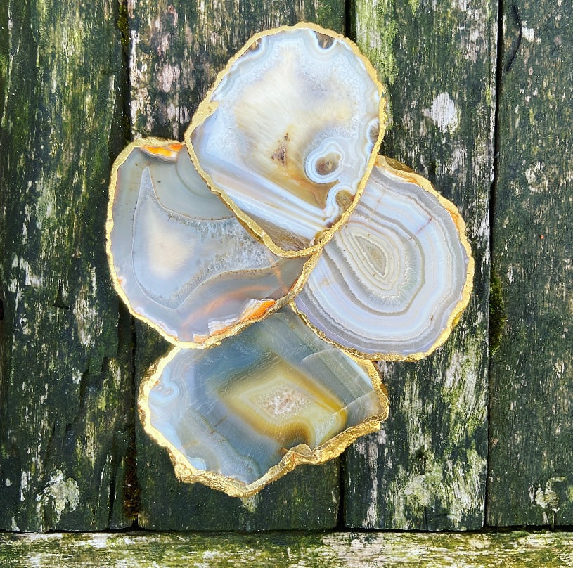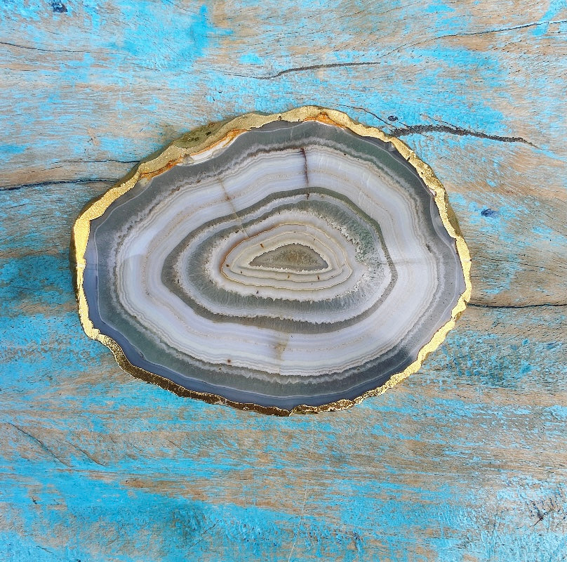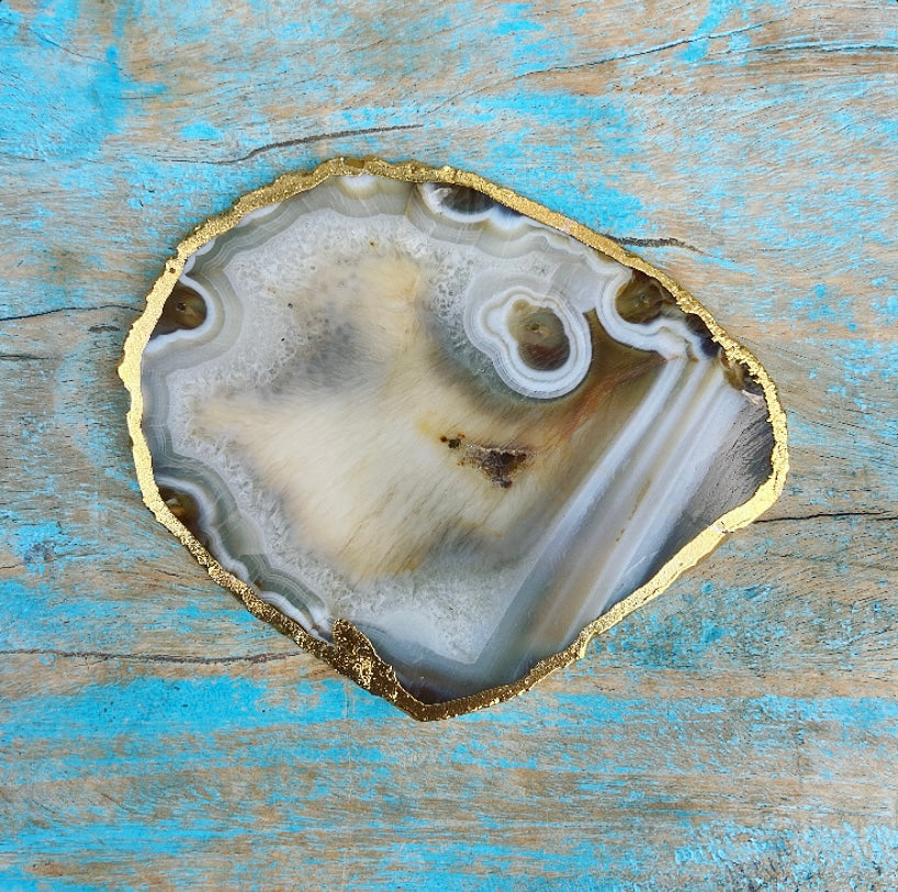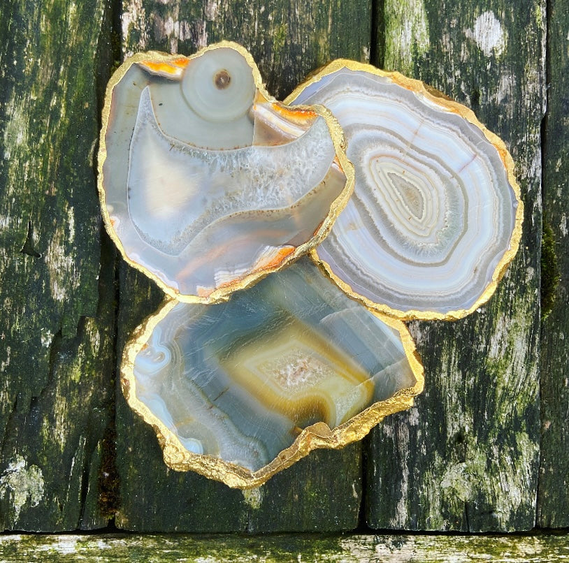 Deze eeuwenoude agaat is ondergronds gegroeid, diep in de schoot van Moeder Aarde. De schijven zijn voorzien van een vergulde rand, wat ze extra bijzonder maakt.