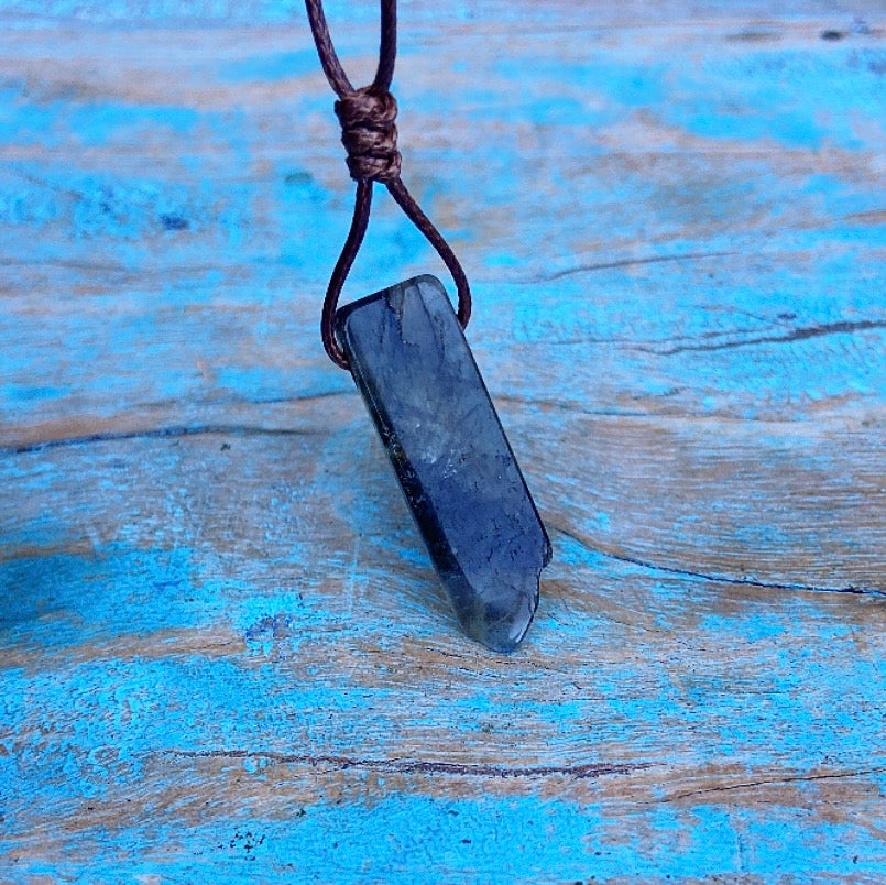 Deze ruige stoere labradoriet hangers worden graag gedragen door schoolgaande kinderen, maar zeker ook door gevoelige grote mensen die zich af en toe even willen afsluiten voor de uitstraling van andere grote mensen. Voorzien van een verstelbare veter, dus past altijd. Aardse hangers, recht en hoekig, met soms een ruw randje.