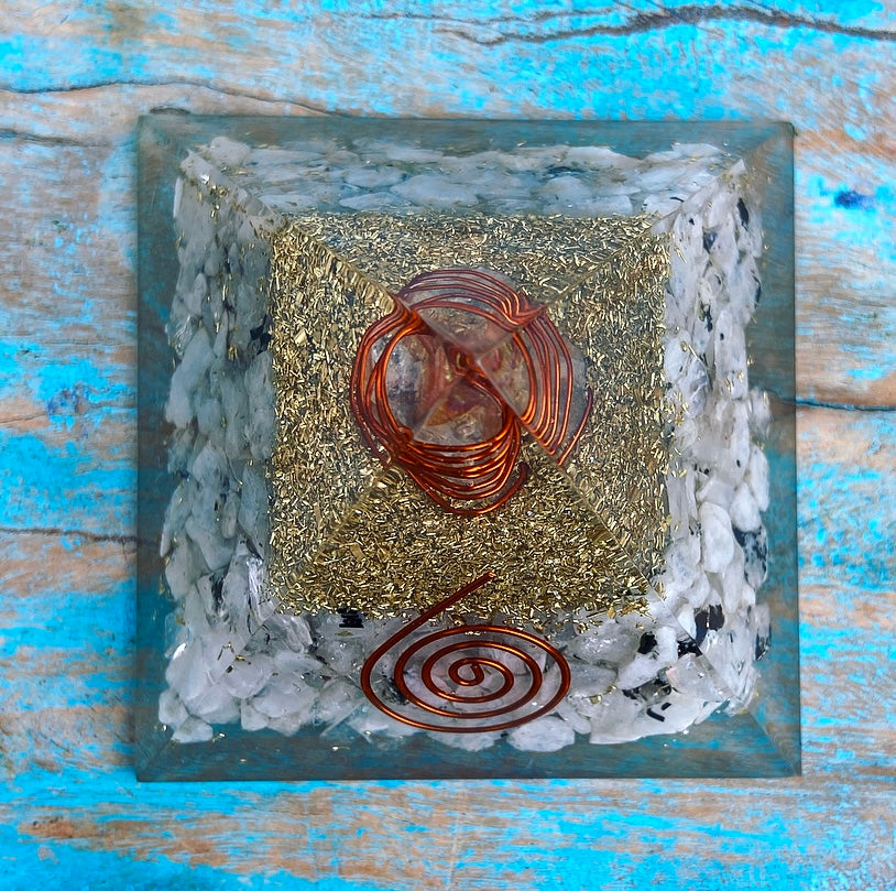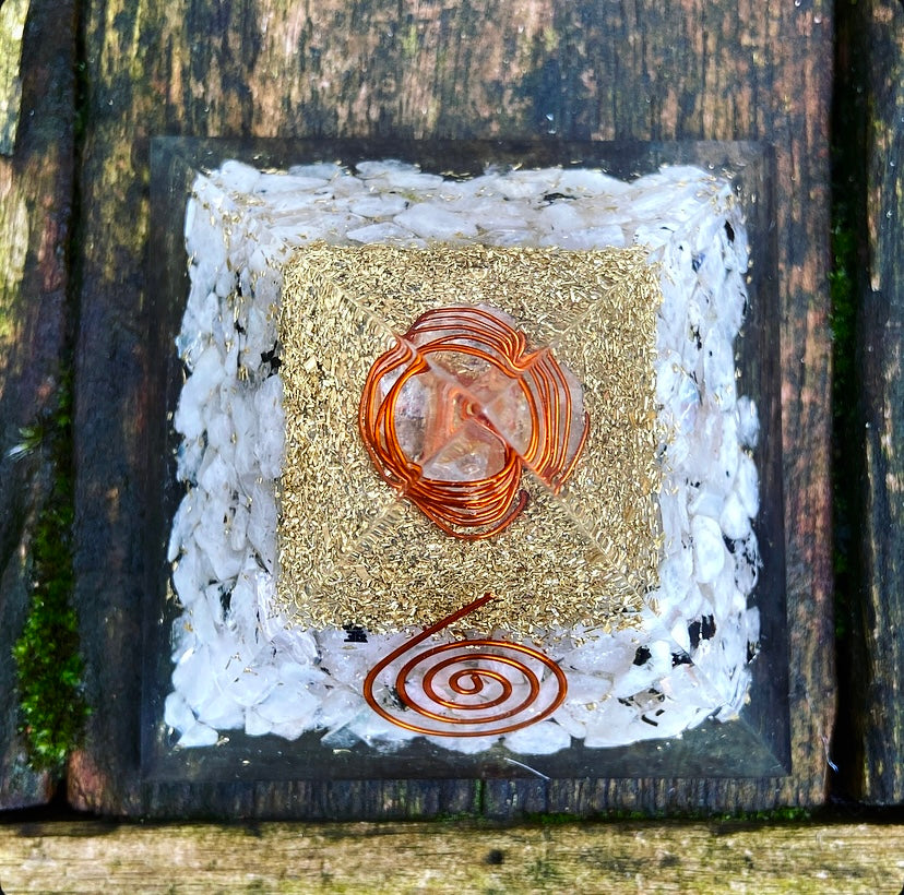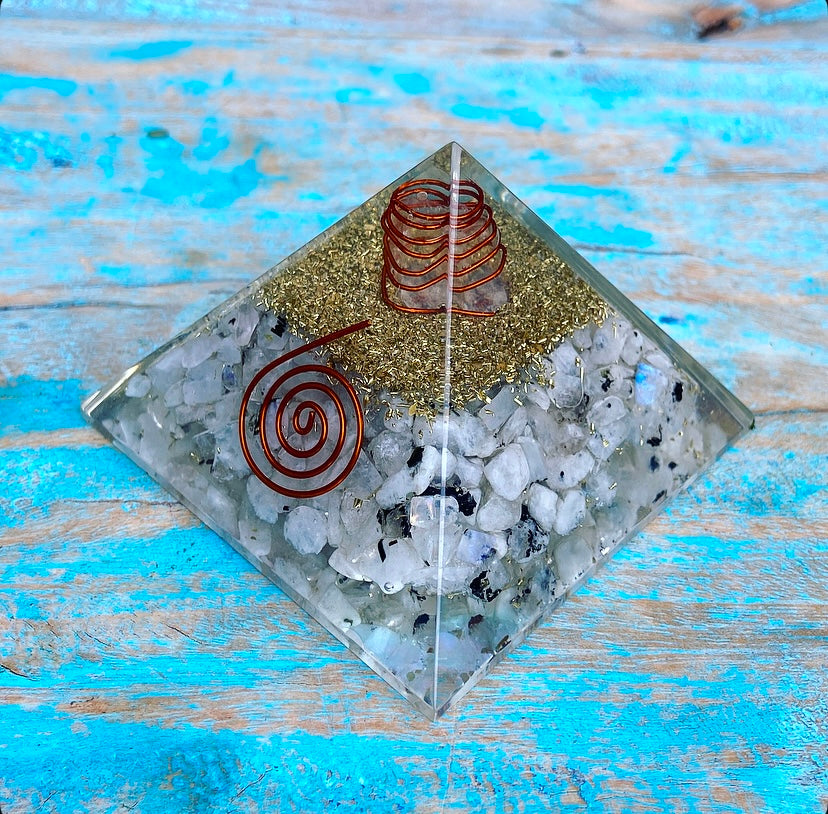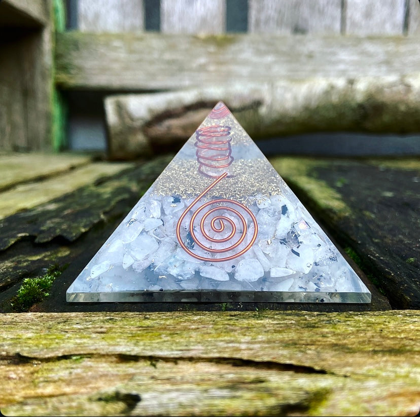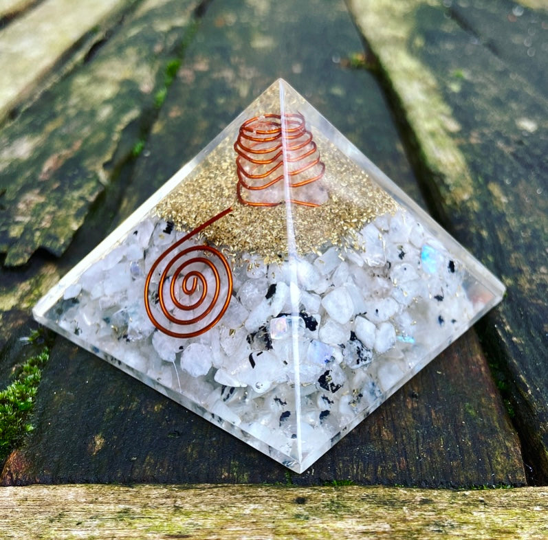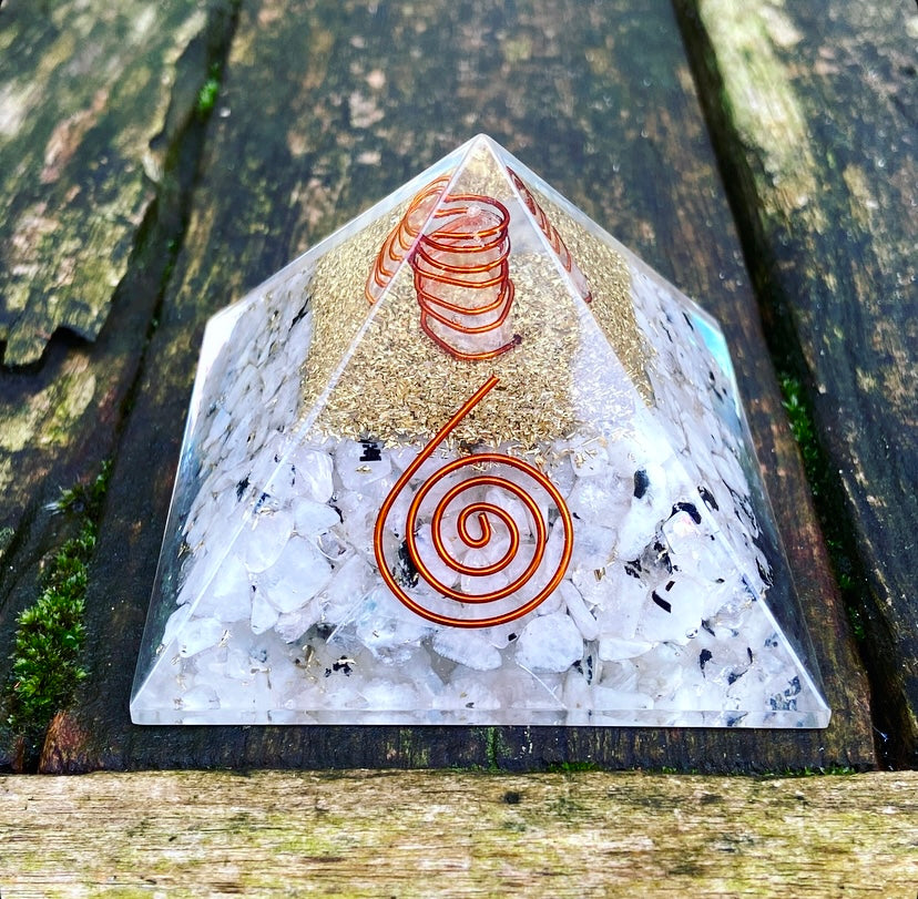 The pyramid contains spiral copper wires that conduct and amplify energy. These spirals act as energetic antennas, which not only maximize the power of the moonstone, but also harmonize and distribute orgone energy - the universal life energy.