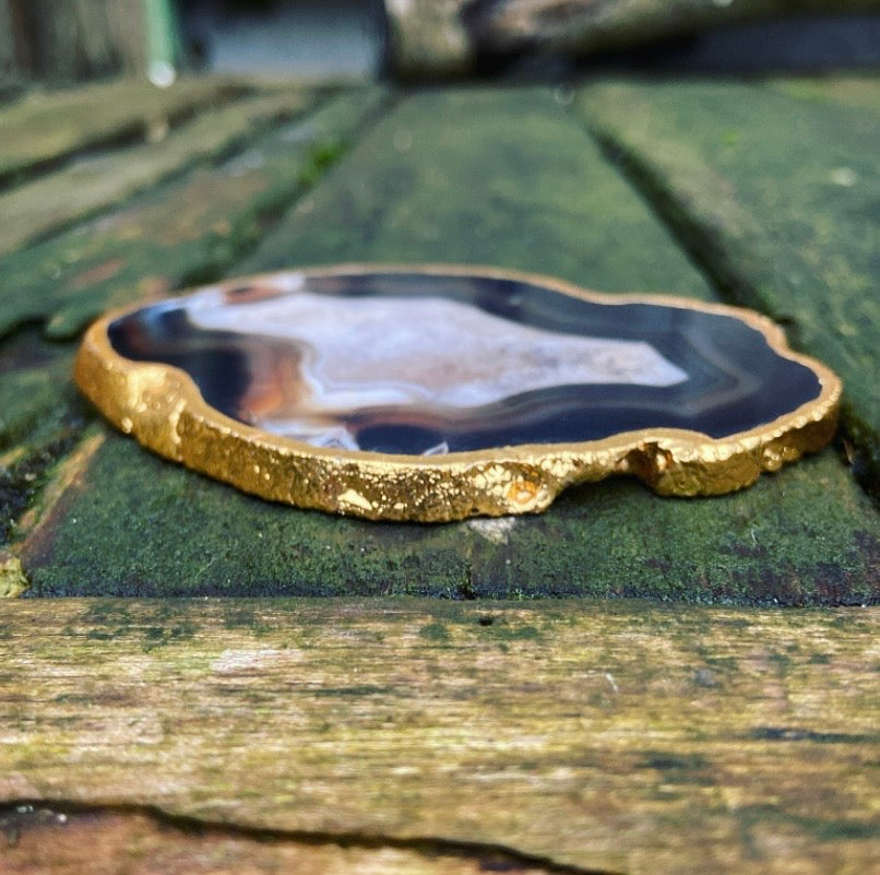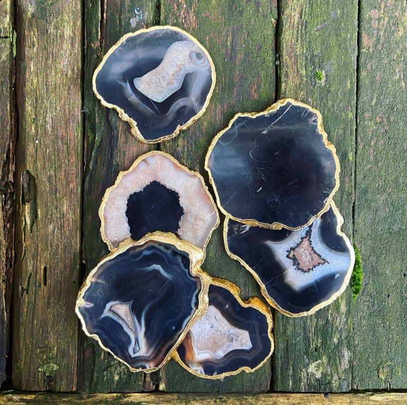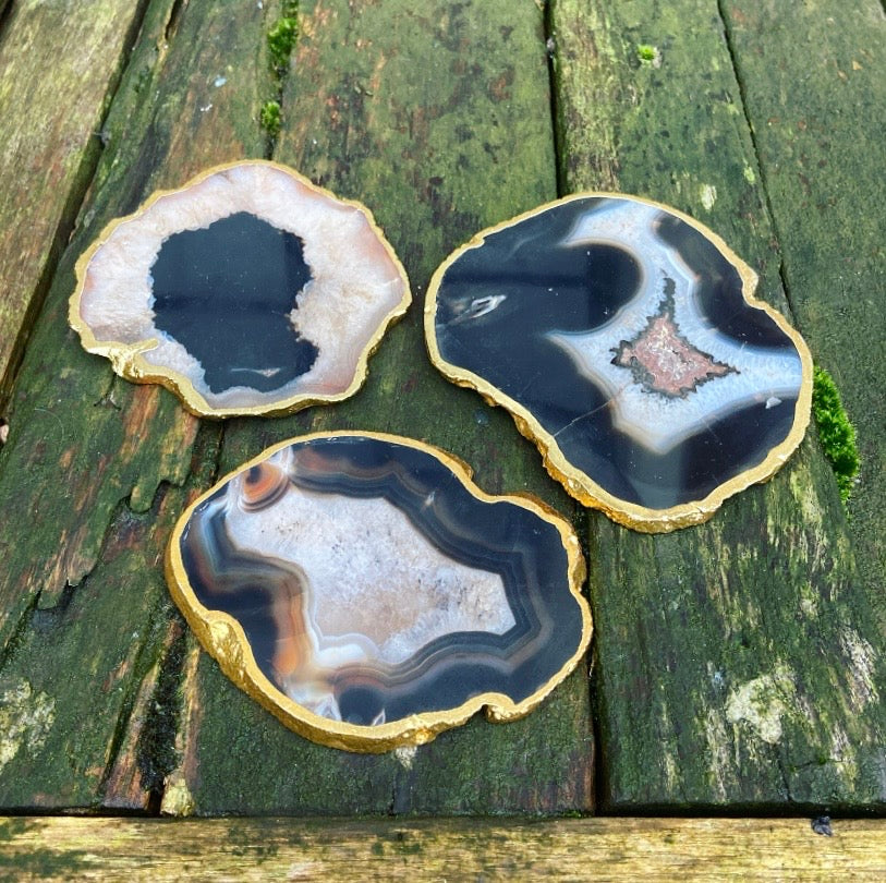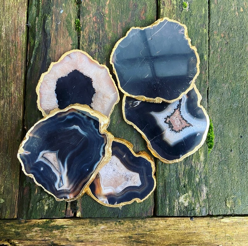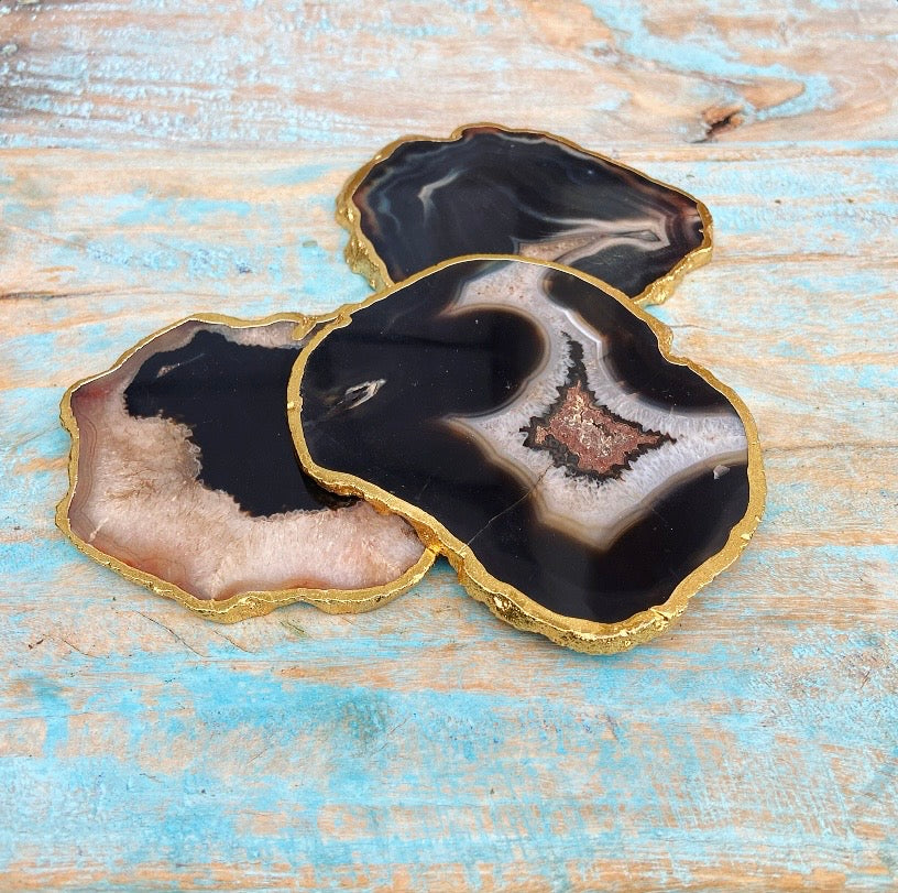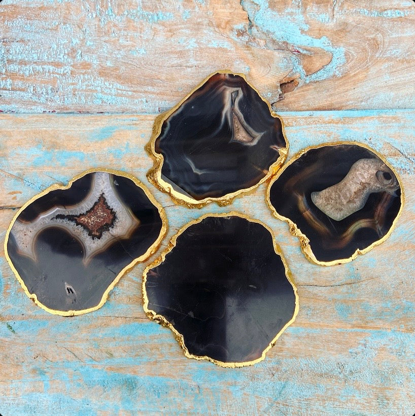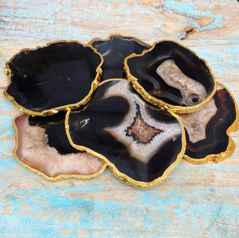 Deze onderzetters van gepolijste zwarte agaat zijn extra betoverend door het chique laagje bladgoud aan de zijkant. Zo wordt ieder kopje koffie of thee een ontstressend genietmomentje.