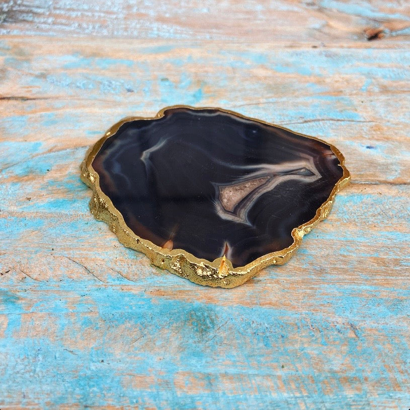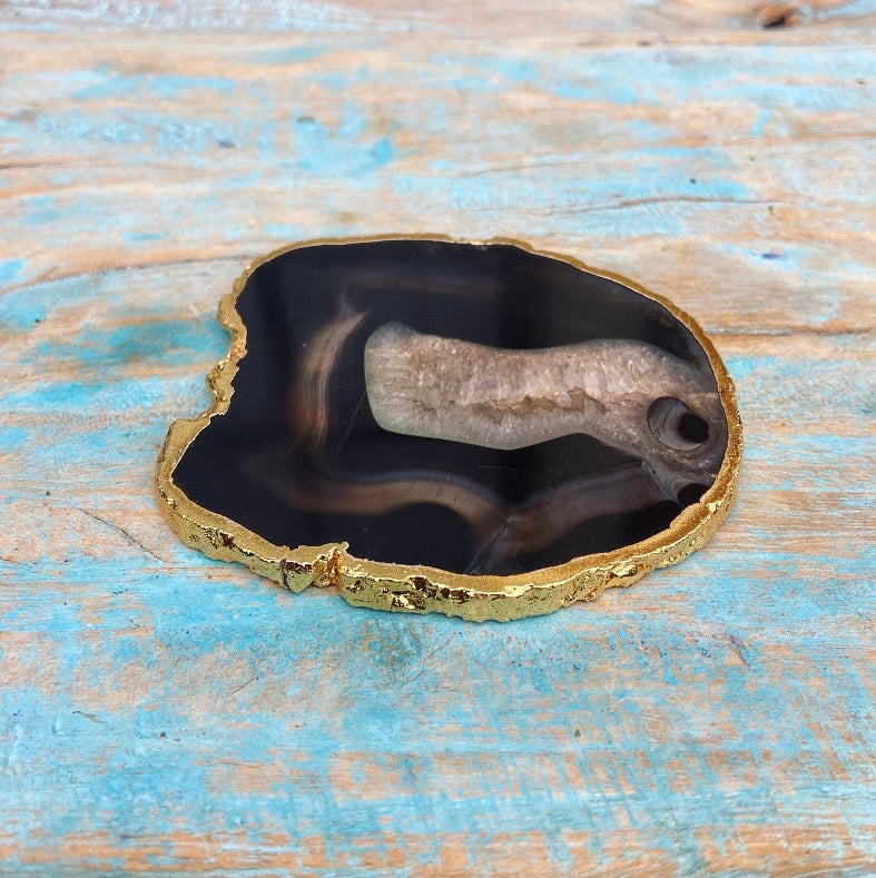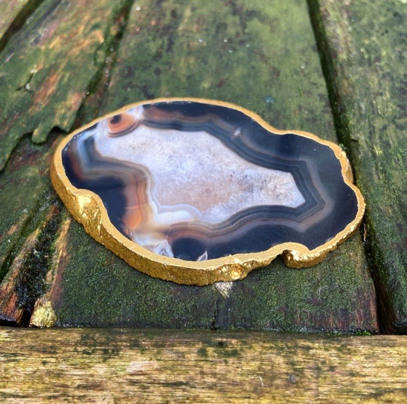 Deze onderzetter van zwarte agaat doet het altijd goed als cadeau voor harde werkers of mensen die in iets ruiger vaarwater zitten. Agaat brengt kalmte en innerlijke rust, en neemt de rem weg om vaker de bewuste ontspanning op te zoeken, in plaats van onszelf te dwingen altijd maar door te gaan.