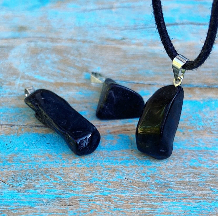 We have beautiful natural chunks of black tourmaline that you can wear as a protective pendant. The chunks are rough, about 2 cm in size and all have irregular shapes. Order a lace or chain directly below.