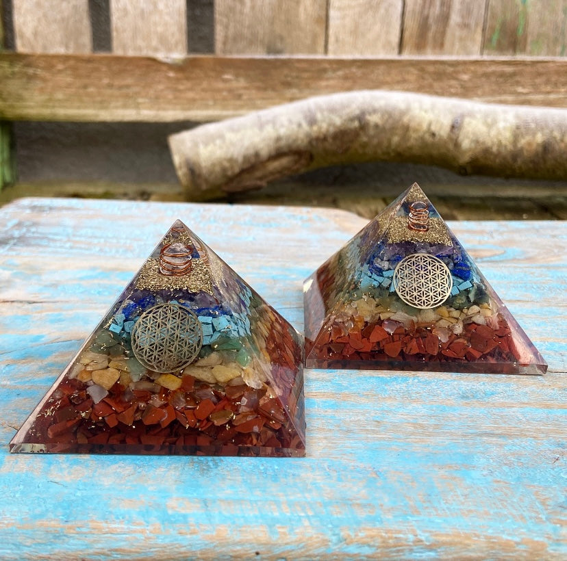 Deze helende chakra kristallen zijn verzegeld in een schitterende orgon piramide die je in huis kunt neerzetten om zo een holistische krachtplek van optimisme, levensenergie en gezondheid te creëren.