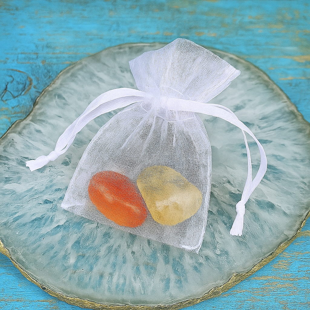 Citrien (authentiek, geen gebrande amethist!) en carneool in een organza buideltje, met betekeniskaartje erbij.
