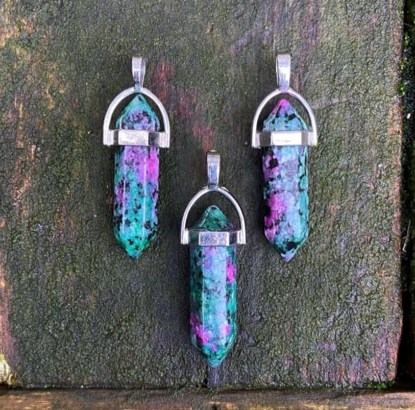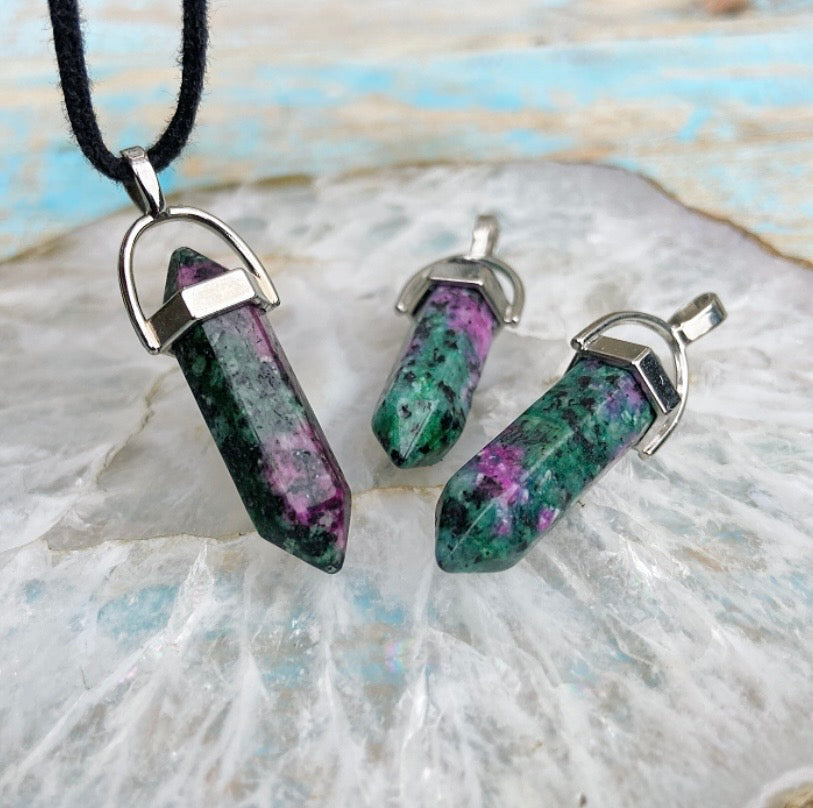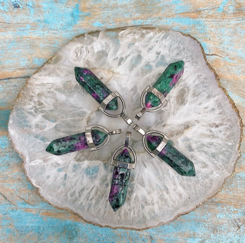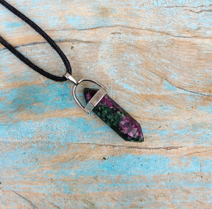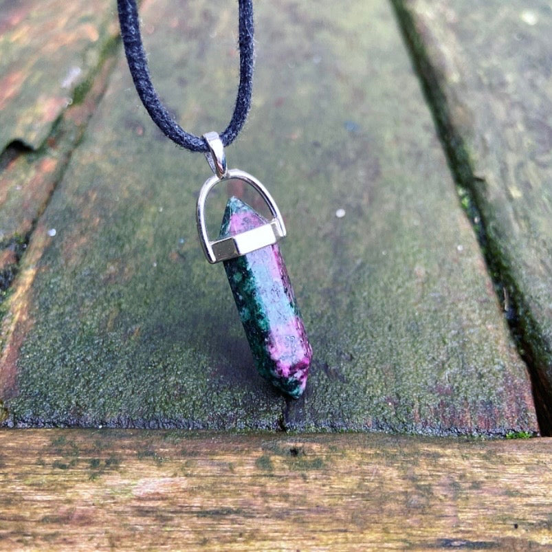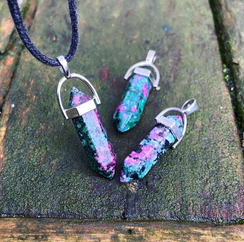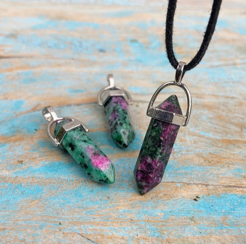 Dit hangertje bevat de edelsteen robijn in het moedergesteente fuchsiet. Fuchsiet brengt inzicht en eigenwaarde. Het hangertje is 2-3 cm groot en ieder exemplaar is uniek. Zoals je op de foto's kunt zien bevat de ene hanger net iets meer zichtbare rode robijn, maar allemaal bevatten ze robijn en ze zijn stuk voor stuk bijzonder!