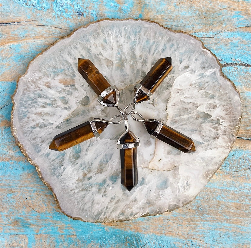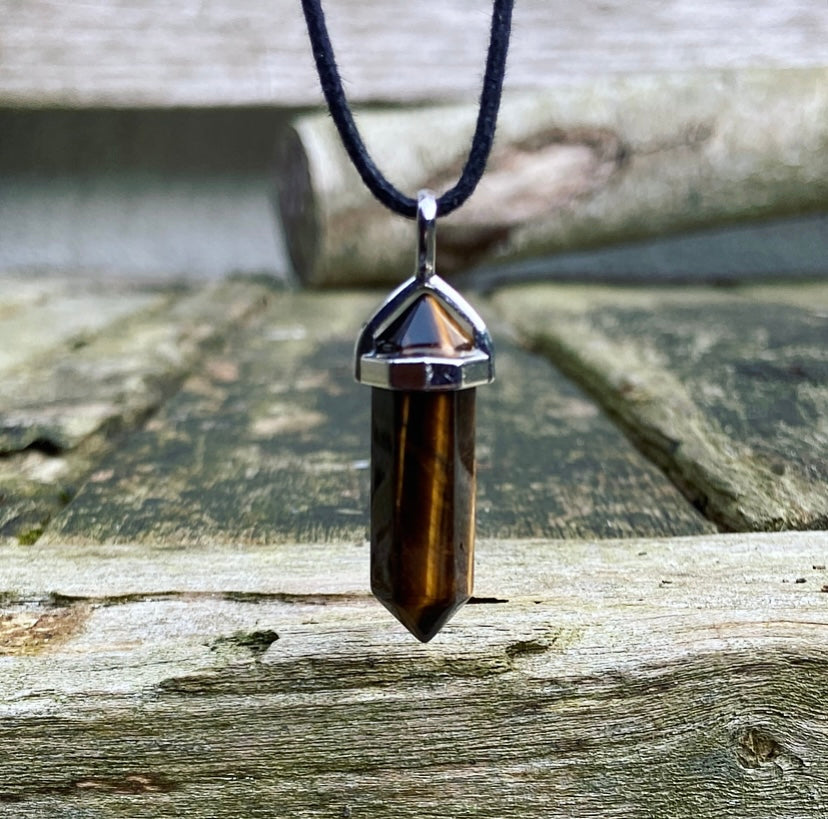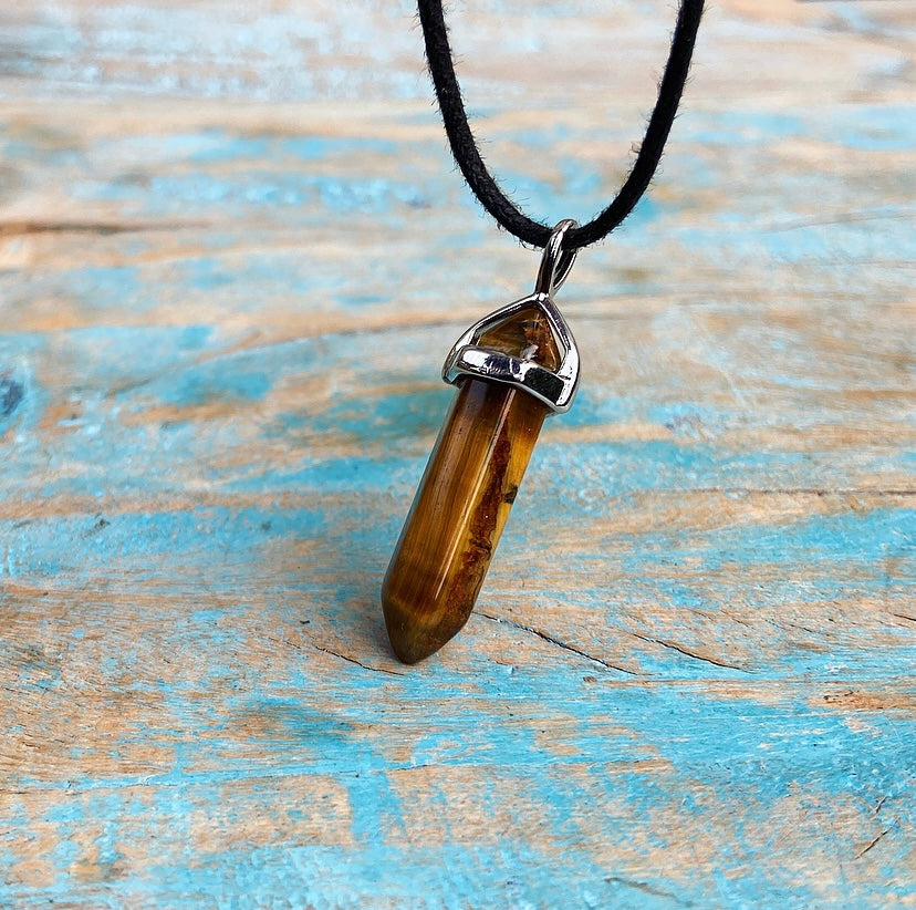 Deze edelsteen hanger met dubbele kristalpunt is speciaal ontworpen om de energie doorstroming in je aura te bevorderen. De tijgeroog versterkt je zonnevlecht, het derde chakra dat je persoonlijke kracht en vitaliteit beïnvloedt.