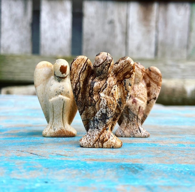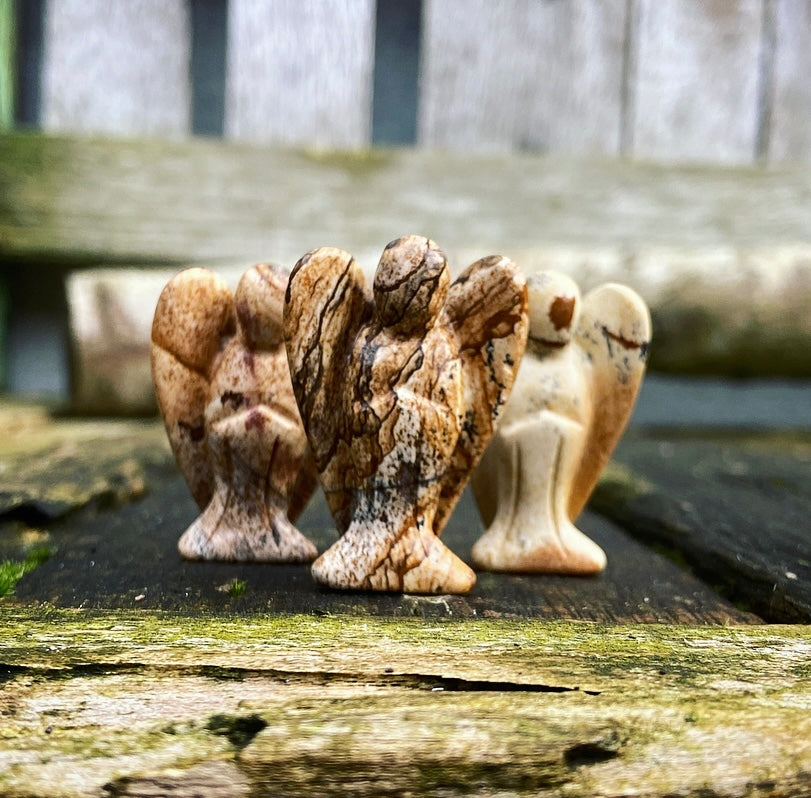 Deze mooie jaspis engel is nieuw in ons assortiment. De foto's zijn representatief voor de voorraad, je ziet dat iedere engel een uniek patroon en kleurenspel heeft. De engeltjess zijn ongeveer 4 cm hoog.