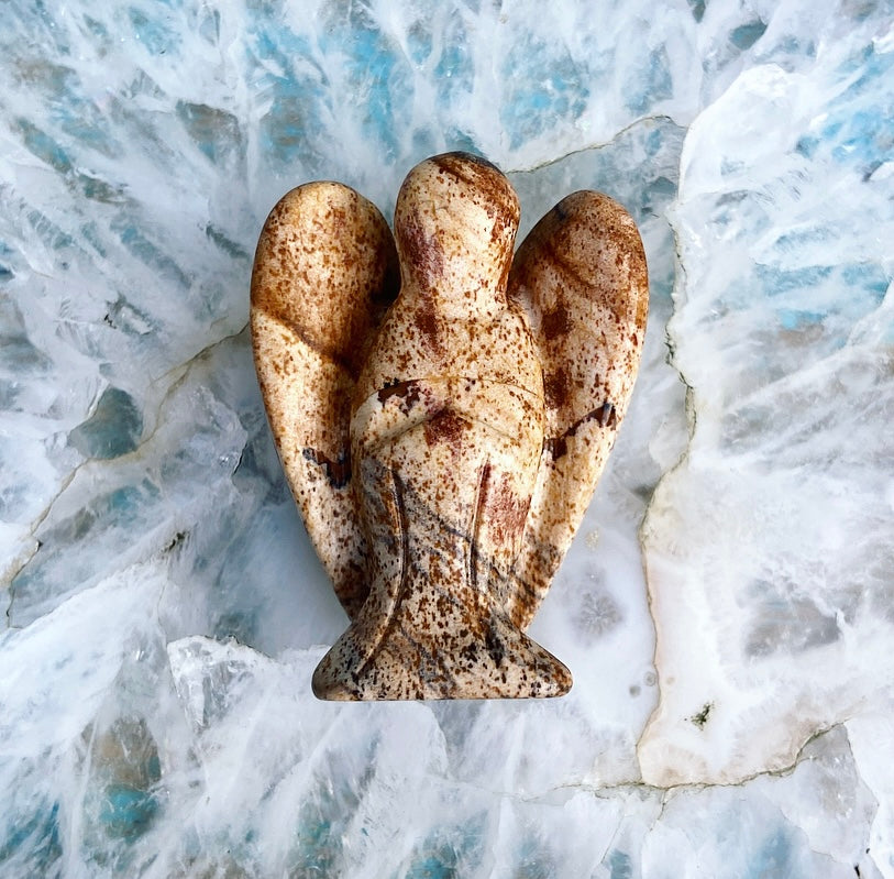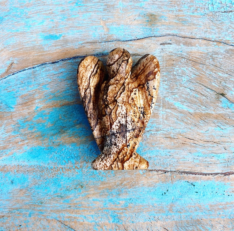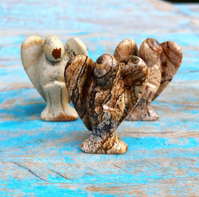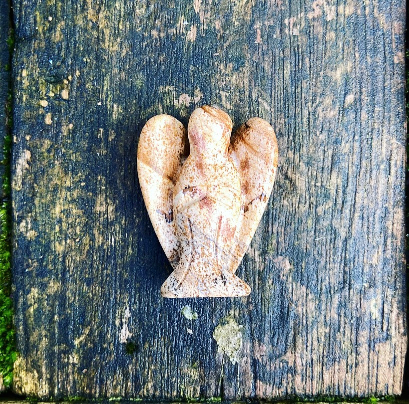 Deze engel van landschapsjaspis geeft kracht.