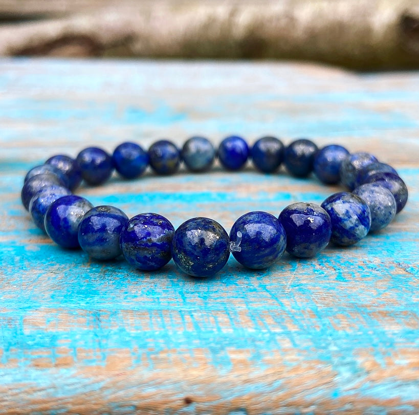 8mm kralen, 19-20 cm omtrek. Lapis lazuli is (licht- of donker)blauw tot grijzig.