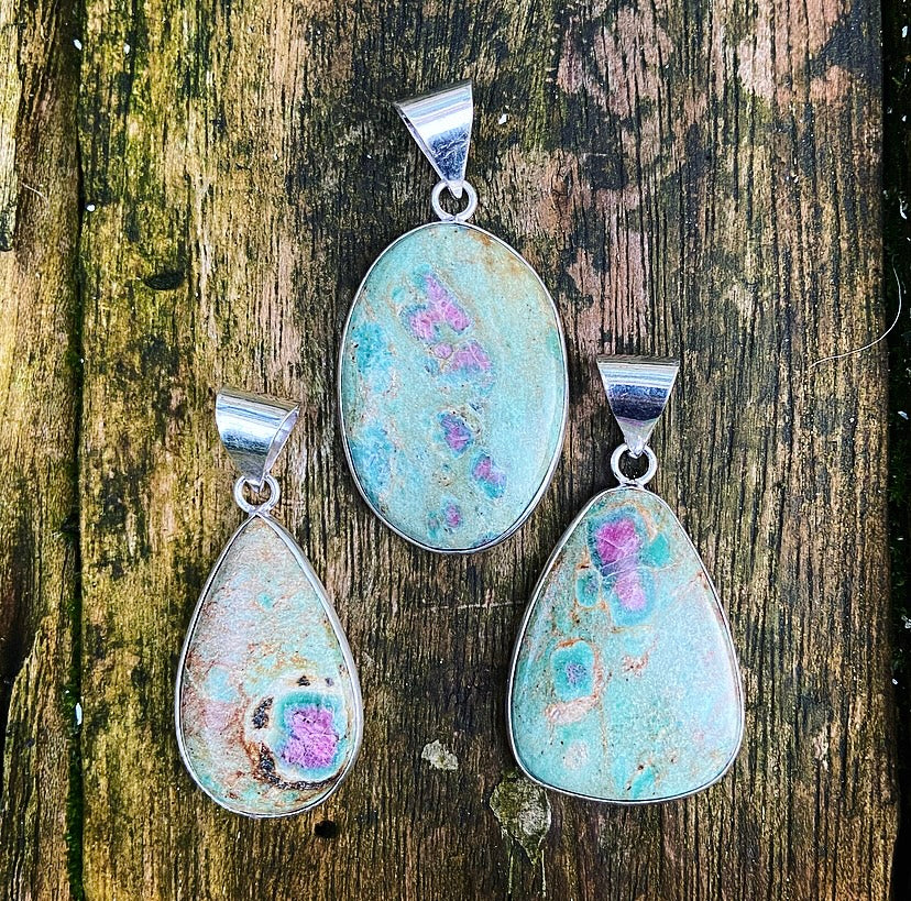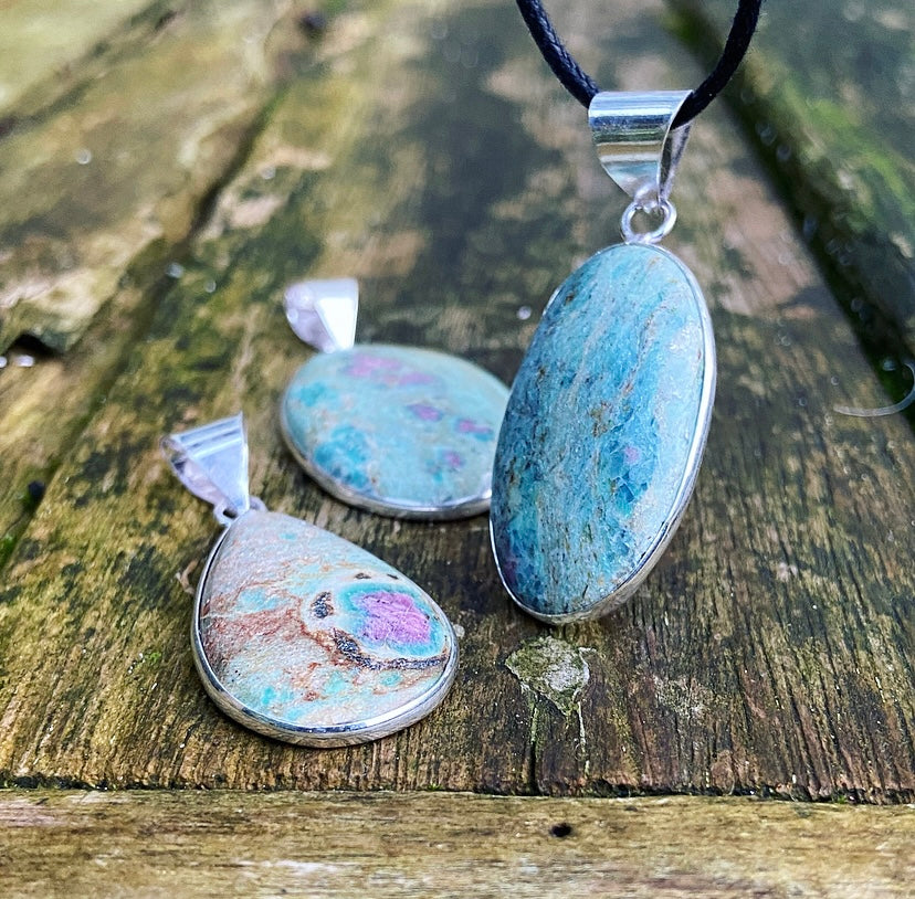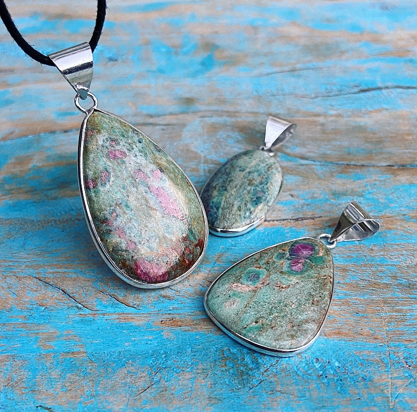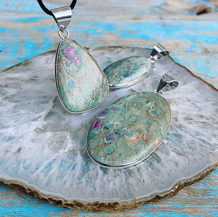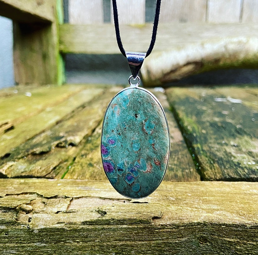 Deze OmAura hanger bevat de edelsteen robijn in het moedergesteente fuchsiet. Fuchsiet brengt inzicht en eigenwaarde. Zoals je op de foto's kunt zien bevat de ene hanger net iets meer zichtbare rode robijn, maar allemaal bevatten ze robijn en ze zijn stuk voor stuk bijzonder, gereinigd, opgeladen en klaar voor gebruik!
