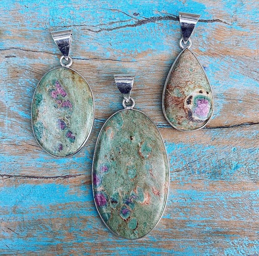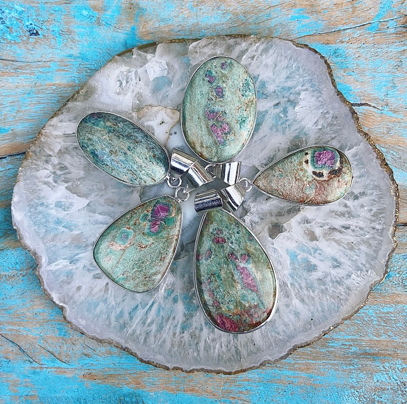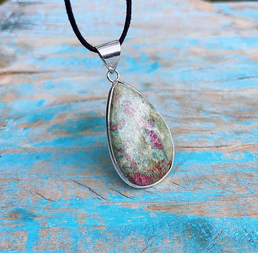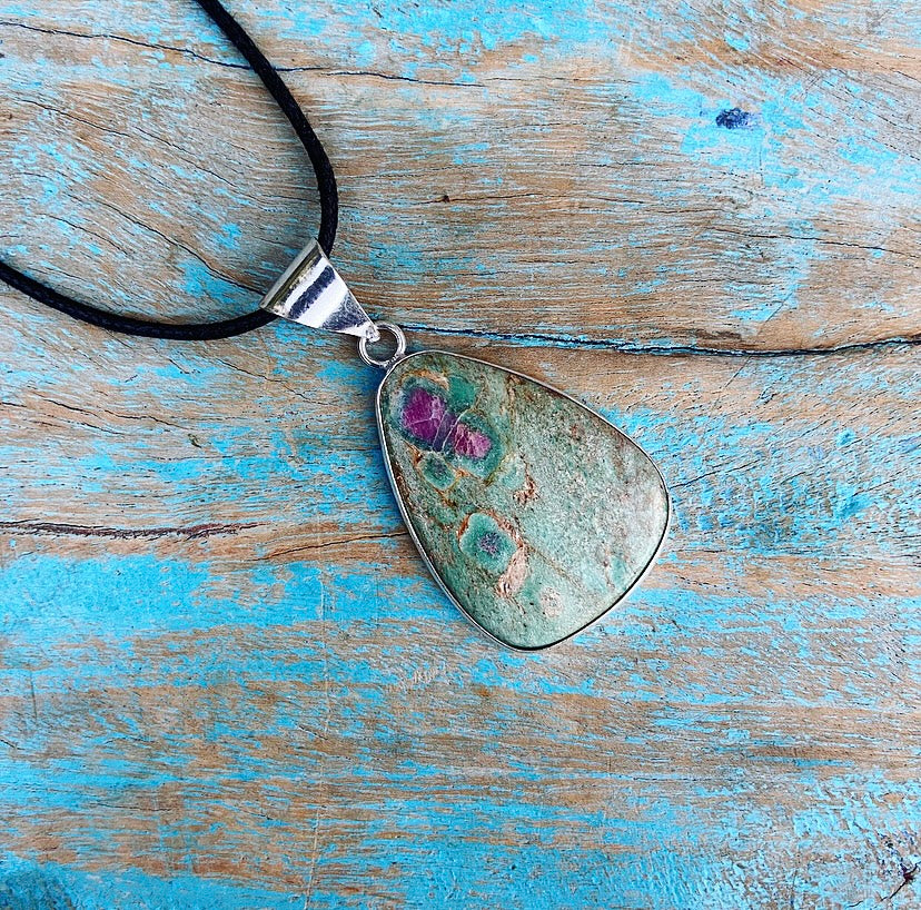 De rode steen staat voor passie, kracht en genezing. Robijn stimuleert de helende kwaliteiten van je hartchakra, het centrum van je zelfgenezende vermogens. Het groene moedergesteente fuchsiet staat voor eigenwaarde en inzicht.
