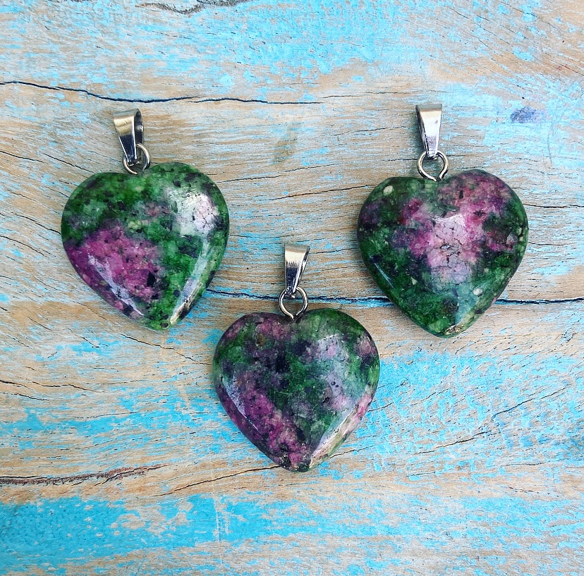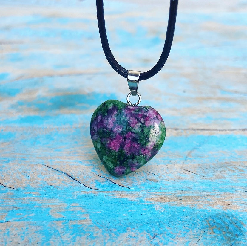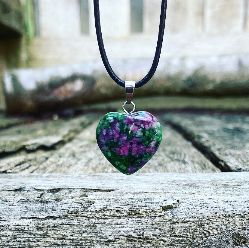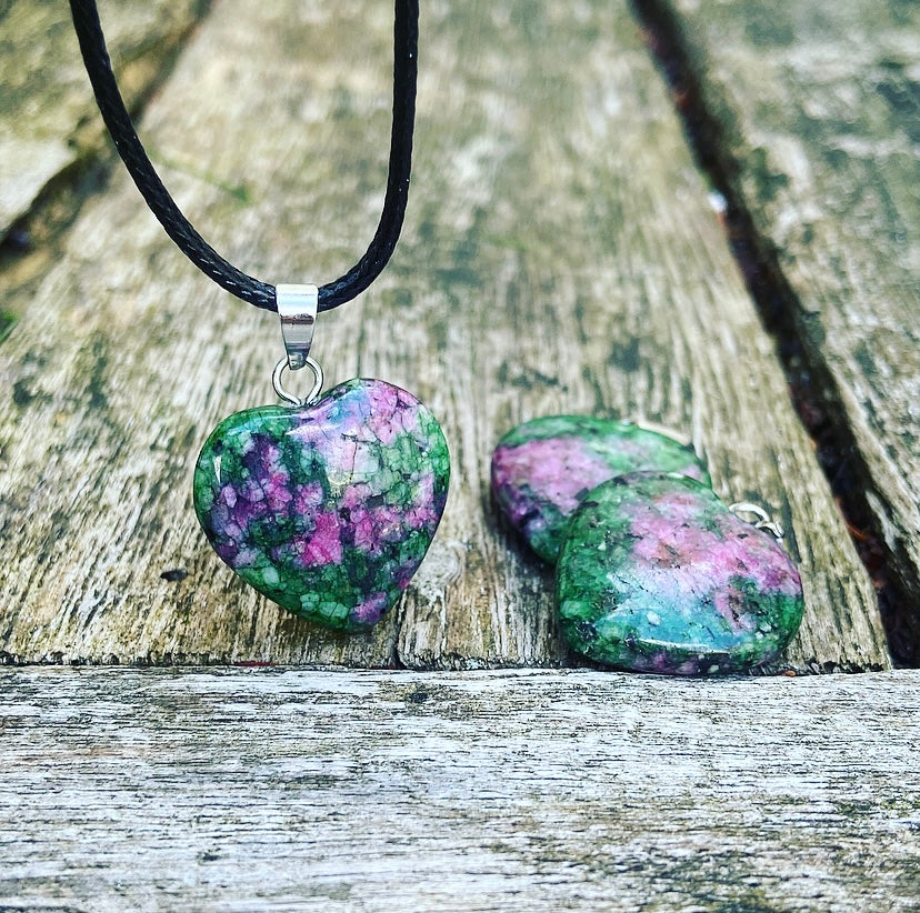 De rode steen staat voor passie, kracht en genezing. Robijn stimuleert de helende kwaliteiten van je hartchakra, het centrum van je zelfgenezende vermogens. Het groene moedergesteente fuchsiet staat voor eigenwaarde en inzicht.