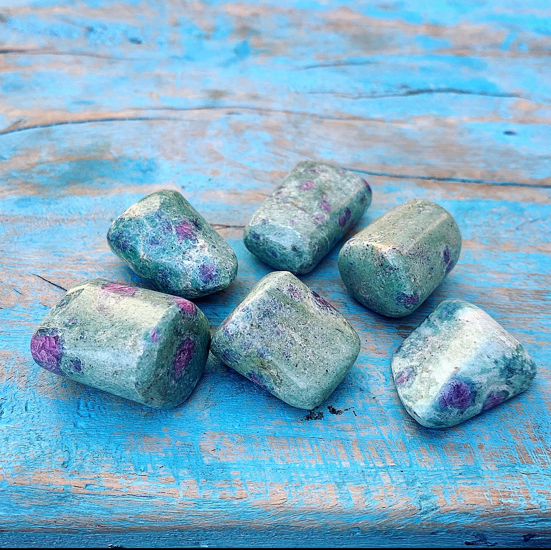 Fuchsiet (het groene moedergesteente waar de rode robijn in groeit) brengt inzicht en eigenwaarde.