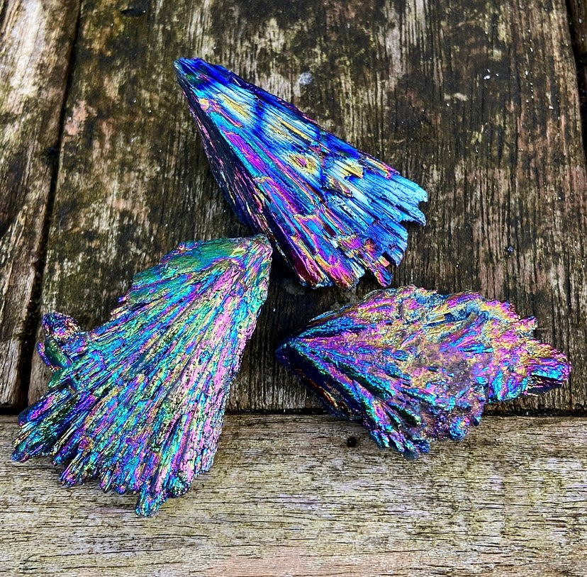 Deze natuurlijke, ruwe kyaniet stukken zijn gecoat met titanium. De gebundelde energie werkt positief in op blokkades zonder dat je per se altijd naar de kern van het probleem of de oorzaak hoeft te gaan. De edelsteen Kyaniet fluistert je in dat het leven soms ook wel eens moeiteloos mag zijn, en dat je niet altijd zo hard je best hoeft te doen.